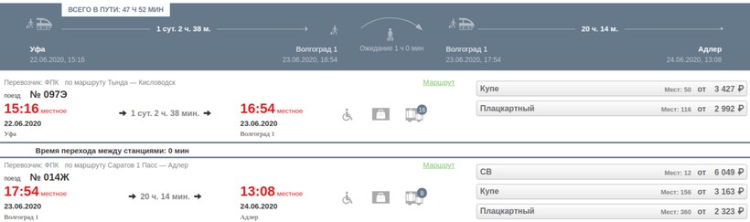 Добраться до Адлера, можно с пересадкой в Волгограде. Есть немало вариантов, однако это один из самых удобных по времени. Отправление из Уфы в 15:16 на поезде № 097Э (курсирует через день), прибытие через 1 день 2,5 часа, в 16:54. Далее предстоит пересадка, которая занимает всего 1 час. Выезд со станции Волгоград-1 в 17:54 на составе № 014Ж (ходит по нечетным датам, за исключением первых чисел некоторых месяцев), приезд в Адлер через 20 часов 14 минут, в 13:08. В определенные дни расписание другое. По времени путешествие с пересадкой занимает почти 2 дня, это даже чуть быстрее, чем на прямом поезде. Составы не новые, но вагоны чистые, аккуратные. Коротко о сервисе: