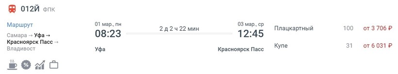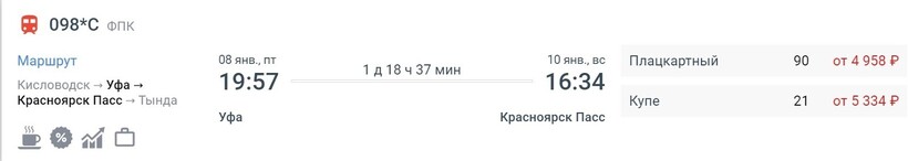 В зависимости от месяца, минимальная стоимость билета на поезд Уфа (Россия) — Красноярск (Россия) колеблется от 2535 (ноябрь, поезд 098*С) до 5 680 рублей (август), а в среднем купить билет можно за 3748 — 4 176 рублей.