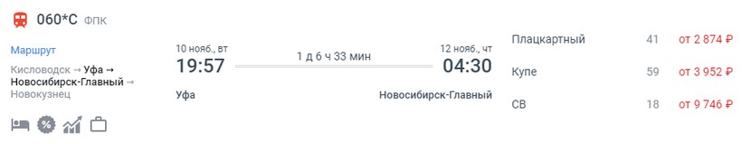 На октябрь-ноябрь минимальная стоимость билета в Новосибирск составляет 1946 (поезд 130*С, Плацкарт), а максимальная — 5955 (поезд 130*С, Купе).