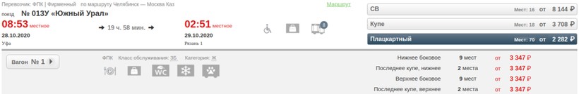 Фирменный состав № 013У «Южный Урал» выезжает ежедневно в 08:53, прибывает — в 02:51 (заказывайте трансфер с вокзала заранее). Время в пути составляет 19 часов 58 минут. Стоянка поезда в Рязани — 12 минут, готовьтесь к выходу заранее. Проводники заблаговременно сообщают о станции прибытия, будят, проспать не получиться.
