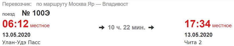 Некоторые составы ходят ежедневно, другие — через день, третьи — в определенные дни или месяцы. В сутки есть минимум три-четыре варианта поездки, можно выбрать максимально удобный. Между Улан-Удэ и Читой 557 километров, такое расстояние можно преодолеть за девять/одиннадцать с половиной часов. Отправление с ж/д вокзала в Улан-Удэ, прибытие на станцию Чита-2.