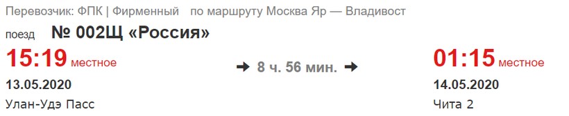 График курсирования оставляет желать лучшего, состав ездит только по средам. Отправление — 15:19, прибытие — 01:15, неудобно, нужно заранее подумать о том, как добраться до нужного места. До Читы поезд домчится за 8 ч. 56 мин. По понедельникам и пятницам ходит состав № 002М — не фирменный, но по сервису и комфорту такой же (прибытие — 01:29/01:38). По вторникам (до средины мая) и по вторникам и четвергам (с середины сентября и далее) ходит № 062М. Эти поезда ходят по такому же расписанию, как и фирменный «Россия». Коротко о сервисе и услугах в поезде № 002Щ: