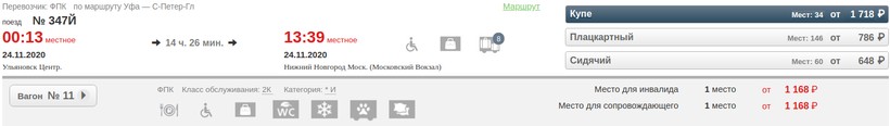 На ноябрь-декабрь минимальная стоимость билета в Нижний Новгород составляет 745 (поезд 347Й, Сидячий), а максимальная — 2070 (поезд 347Й, Купе).