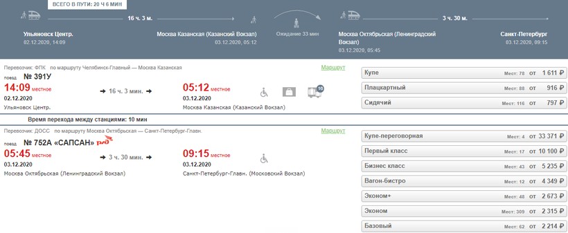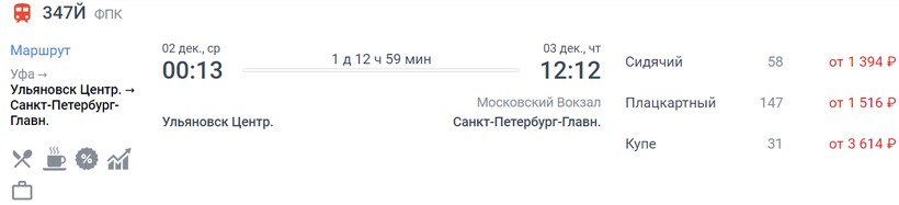 На ноябрь-декабрь минимальная стоимость билета в Санкт-Петербург составляет 1602 (поезд 347Й, Сидячий), а максимальная — 9660 (поезд 347Й, Купе).