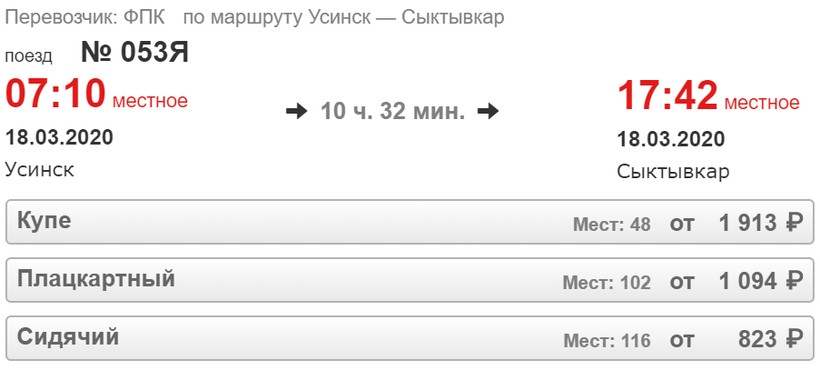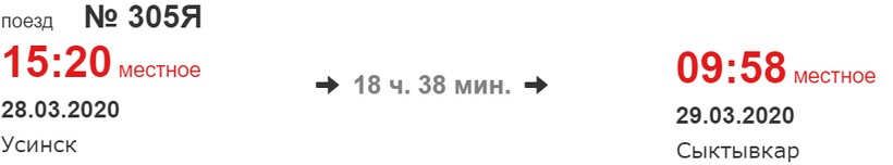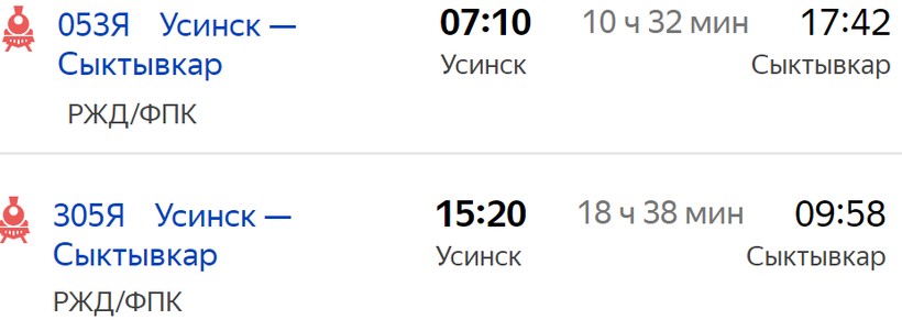 Хотя поезд № 305Я преодолевает расстояние между городами за 18,5 часа, я отдаю предпочтение путешествию на данном составе по нескольким причинам. Во-первых, потому что основную часть маршрута он проезжает в вечернее/ночное время: отправляется из Усинска в 15:20, в Сыктывкар прибывает утром — в 09:58 (подойдет, например, командировочным).