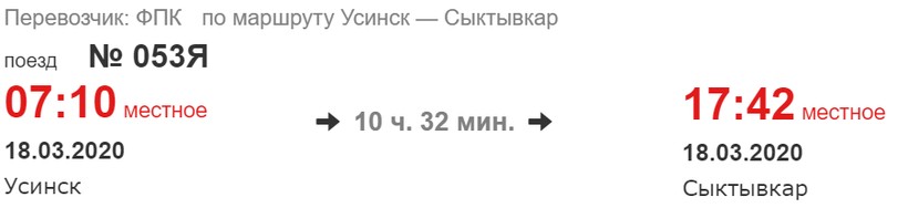 Состав № 053Я находится в пути всего 10,5 часа: из Усинска отправляется в 07:10, прибывает в точку назначения к 17:42. График движения поезда назвать удобным не могу, потому что на преодоление маршрута тратится довольное большое количество дневного времени.