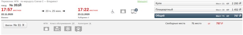 На октябрь-ноябрь минимальная стоимость билета в Хабаровск составляет 885 (поезд 351Й, Сидячий), а максимальная — 3949 (поезд 351Й, Купе).