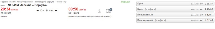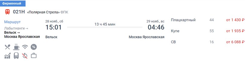 На октябрь-ноябрь минимальная стоимость билета в Москву составляет 916 (поезд 375Я, Сидячий), а максимальная — 8971 (поезд 021Н Полярная Стрела, Люкс).