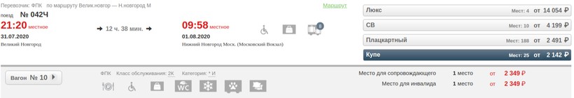 Актуальные цены и расписание поезда Великий Новгород — Нижний Новгород, стоимость и информация о наличии билетов на скорые поезда АО «ФПК».