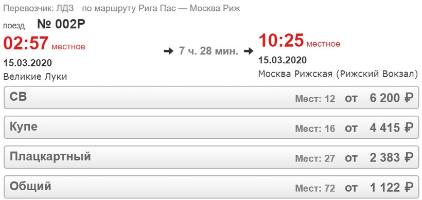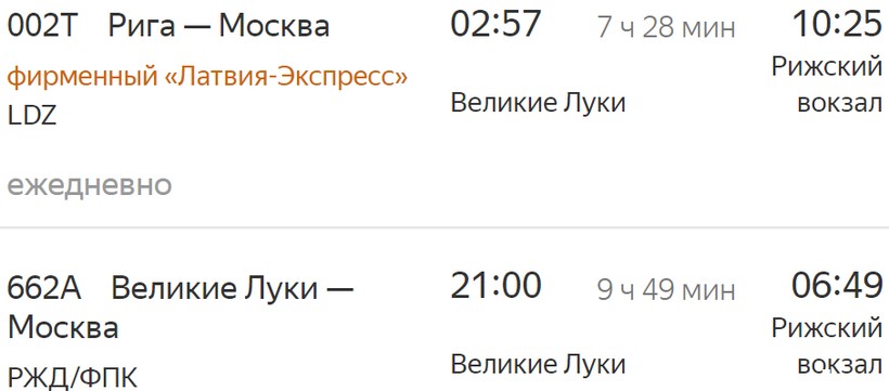 Преодолеть маршрут ежедневно получится всего за 7,5 часа на латвийском поезде № 002Р. Расписание движения состава довольно удобное: отправляется из Великих Лук ночью (в 02:57), прибытие в столицу — к 10:25 (подойдет тем, кому нужно попасть в точку назначения ко второй половине дня).