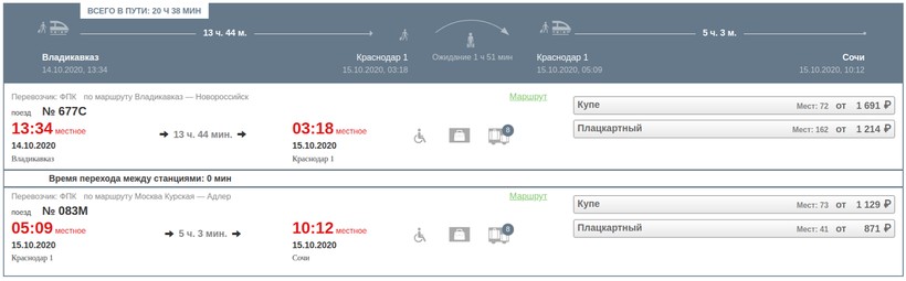 В качестве альтернативы предлагаю рассмотреть вариант с пересадкой. Выбирайте его только в случае крайней необходимости, путешествие через транзитный город не так комфортно, как на прямом поезде. Среди минусов — пересаживаться нужно ночью, поездка займет на несколько часов больше (20,5 часа). Преимущество — уехать можно в дни, когда нет прямого рейса. Добраться до Сочи можно, сделав пересадку в Краснодаре. Выезд из Владикавказа (в 13:34) на поезде № 677С, прибытие в Краснодар через 13 часов 44 минуты — в 03:18. Состав курсирует только по четным датам.