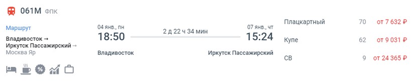 В зависимости от месяца, минимальная стоимость билета на поезд Владивосток (Россия) — Иркутск (Россия) колеблется от 3743 (ноябрь, поезд 007Н) до 6 465 рублей (июнь), а в среднем купить билет можно за 4574 — 4 651 рубль.