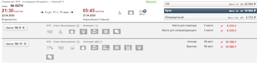 В зависимости от месяца, минимальная стоимость билета на поезд Владивосток (Россия) — Новосибирск (Россия) колеблется от 4998 (ноябрь, поезд 007Н) до 20 955 рублей (сентябрь), а в среднем купить билет можно за 7105 — 7 246 рублей.