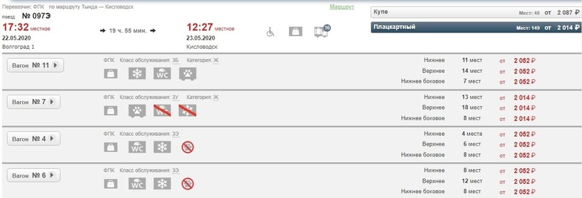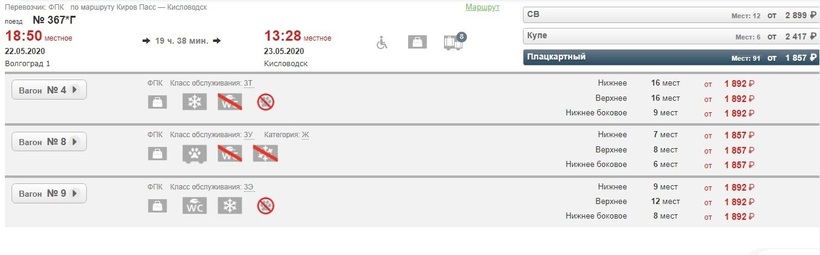 Сколько заплатите за дорогу зависит от типа вагона и срока покупки, например, за неделю до выезда цена будет следующей: