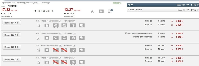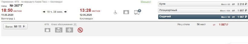 Скорый состав через день отходит от станции Волгоград-1 в 17:32 и приходит в Кисловодск в 12:27. В пути — около 20 часов. В составе только купейные и плацкартные вагоны. Все купированные оснащены кондиционерами, но биотуалеты есть не во всех, в плацкарте эти блага цивилизации могут отсутствовать. В купе предусмотрены места для лиц с инвалидностью. Если путешествуете с питомцами (опция доступна в купированных вагонах), за мелких животных нужно платить дополнительно, для крупной собаки выкупать купе. Из неудобств — нехватка розеток. Бывают неработающие туалеты. С вагоном как повезет, убирают не везде и не регулярно, можно столкнуться с пылью и грязью. За неделю до выезда цена примерно такая: