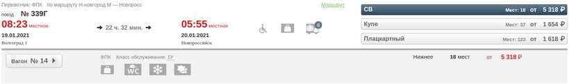 На октябрь-ноябрь минимальная стоимость билета в Новороссийск составляет 1106 (поезд 339Г, Плацкарт), а максимальная — 7140 (поезд 339Г, Люкс).