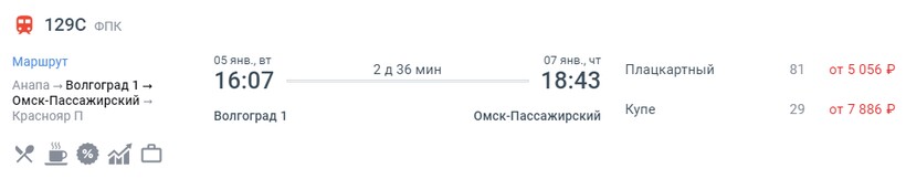 В зависимости от месяца, минимальная стоимость билета на поезд Волгоград (Россия) — Омск (Россия) колеблется от 2449 (ноябрь, поезд 127*Ы) до 5 252 рубля (январь), а в среднем купить билет можно за 3510 — 4 028 рублей.