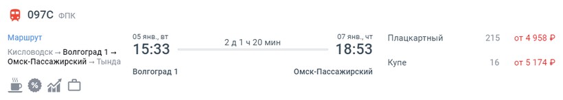 На октябрь-ноябрь минимальная стоимость билета в Омск составляет 2449 (поезд 127*Ы, Плацкарт), а максимальная — 14553 (поезд 059С, Люкс).