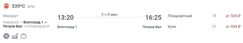 На октябрь-ноябрь минимальная стоимость билета в Петрова Вала составляет 442 (поезд 367С, Сидячий), а максимальная — 3791 (поезд 345*С, Люкс).