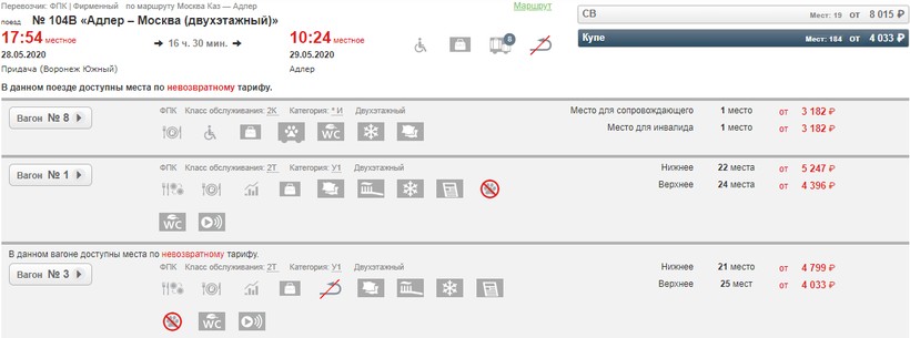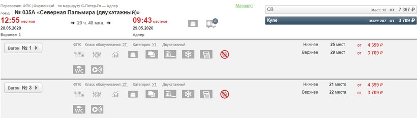 Поездка в купе обойдется в 4033 ₽; в СВ — 8015 ₽ (цены указаны за месяц до выезда). Состав входит в программу динамического ценообразования, проездные могут подорожать ближе к дате выезда, на это влияет популярность маршрута, количество свободных мест. Чтобы сэкономить, приобретайте проездные на верхнюю полку и по невозвратному тарифу (такие билеты дешевле, но вернуть их после покупки невозможно).