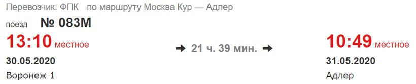 Длина маршрута примерно 1200 километров. Выезд с вокзалов Воронеж-1 или Воронеж-Южный (Придача), прибытие на ж/д вокзал в Адлере.