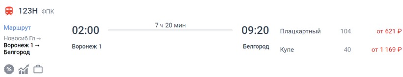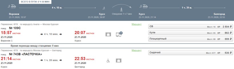 Пересадка длится 1 час 7 мин. Далее нужно сесть на скоростной состав № 743В «Ласточка», он курсирует ежедневно в 21:14. В Белгород электропоезд прибывает через 1 ч. 39 мин. — в 22:53. Общее время в пути — 6 ч. 56 мин. В обоих составах действует динамическое ценообразование (кроме плацкарта). Примерная стоимость проездных документов за месяц до отправления на поезд № 109С:
