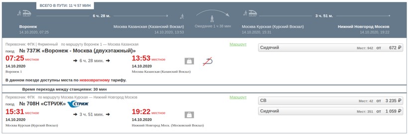 Добраться до Нижнего Новгорода можно, сделав пересадку в Москве. По времени выйдет даже быстрее, чем на прямом поезде (около 12 часов). Среди преимуществ — уехать можно в любой день, билеты обойдутся дешевле. Если вас не пугает необходимость перехода с одного состава в другой, смело выбирайте такой вариант. Отправление из Воронежа (в 07:25/07:33) на фирменном поезде № 737Ж «Воронеж — Москва (двухэтажный)», прибытие через 6,5 часа — в 13:53. Рейс ежедневный. Вагоны с местами для сидения. Предоставляется питание, пресса, пледы. Есть биотуалеты, кондиционеры, интернет, розетки. Пересадка занимает 1,5 часа. Приезжает состав на Казанский вокзал столицы, выезжать в Нижний Новгород нужно с Курского. Поэтому следует перейти на другую станцию. Выезд из Москвы (в 15:31) на скоростном поезде № 708Н «СТРИЖ», прибытие через почти 4 часа — в 19:22.