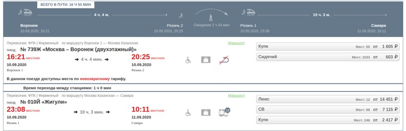 Вариант проезда с пересадкой советую выбирать в случае крайней необходимости, ведь ехать транзитом не так комфортно, как на прямом поезде. Добраться до Самары можно, сделав пересадку в Рязани. Выезд из Воронежа (в 16:21) на фирменном поезде № 739Ж «Москва — Воронеж (двухэтажный)», прибытие в Рязань через 4 часа 4 минуты — в 20:25. Состав курсирует ежедневно, за исключением ноября (рейсы отсутствуют). Предусмотрены купе и вагоны с местами для сидения. Сервис достойный — пассажирам предоставляют питание, пледы, прессу, дорожные наборы. Есть интернет, розетки в достаточном количестве. Персонал дружелюбный, внимательный.
