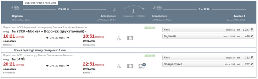 Путешествие транзитом занимает от 4,5 часа. Уехать можно в любой день, много ежедневных рейсов. Однако вариант не очень удобный, в большинстве случаев предполагает пересадку от 1 часа, во время которой нужно переезжать с одного вокзала города на другой. Выбирайте его в случае крайней необходимости. Добраться до Тамбова можно через станцию Богоявленск. Отправление из Воронежа (в 16:21) на фирменном поезде № 739Ж «Воронеж — Москва (двухэтажный)», прибытие через 2,5 часа — в 18:51. Состав курсирует ежедневно.