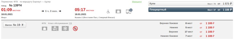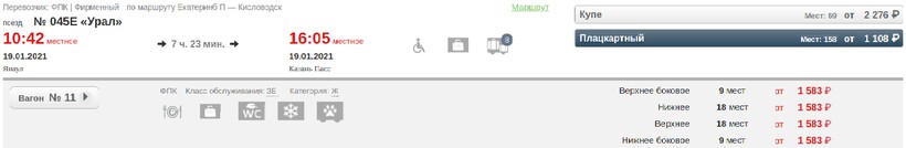 На ноябрь-декабрь минимальная стоимость билета в Казань составляет 742 (поезд 377Г, Плацкарт), а максимальная — 6203 (поезд 377Г, Люкс).