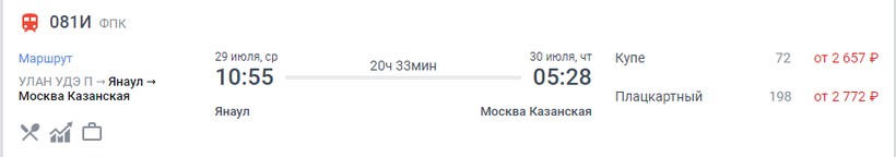В зависимости от месяца, минимальная стоимость билета на поезд Янаул (Россия) — Москва (Россия) колеблется от 1720 (январь, поезд 081И) до 2 636 рублей (июль), а в среднем купить билет можно за 2383 — 2 422 рубля.