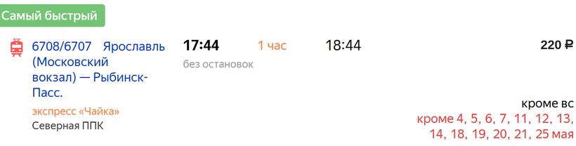 № 6711. Ходит целый год только по воскресеньям. Выезд в 19:06, прибытие — 20:06. Подойдет тем, кто хочет быстро добраться до Рыбинска в выходной день.