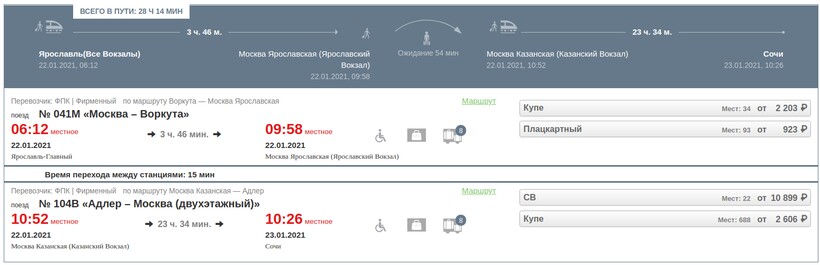 Добраться до Сочи можно, сделав пересадку в Москве. Путешествие занимает в среднем 1 день 4 часа. Отправление из Ярославля (в 06:12) на фирменном поезде № 041М «Москва — Воркута» (курсирует ежедневно с середины декабря, до этого — по четным датам), прибытие через практически 4 часа — в 09:58. Пересадка занимает чуть меньше часа. Нужно поспешить, придется переходить с Ярославского на Казанский вокзал столицы РФ (примерное время перехода — 15 минут). Выезд из Москвы (в 10:52) на фирменном поезде № 104В «Адлер — Москва (двухэтажный)» (ежедневный рейс), прибытие спустя почти сутки — в 09:46/10:26/10:28.