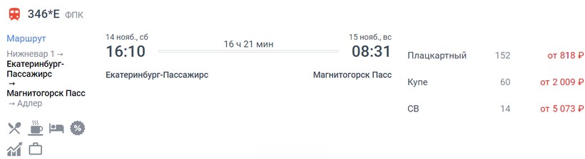На октябрь-ноябрь минимальная стоимость билета в Магнитогорск составляет 908 (поезд 346*Е, Плацкарт), а максимальная — 6622 (поезд 346*Е, Люкс).