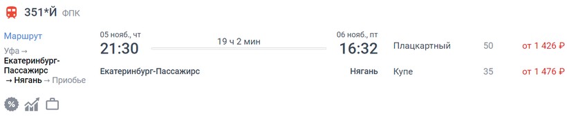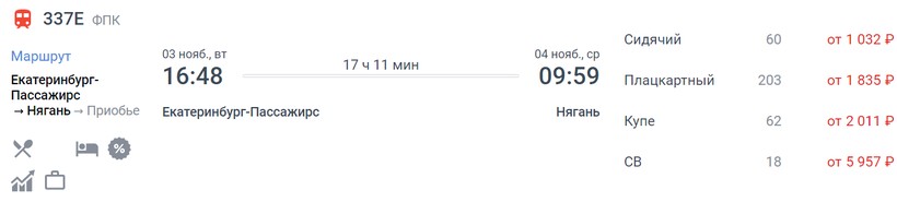 Актуальные цены и расписание поезда Екатеринбург — Нягань, стоимость и информация о наличии билетов на пассажирские поезда АО «ФПК».