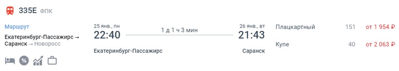 В зависимости от месяца, минимальная стоимость билета на поезд Екатеринбург (Россия) — Саранск (Россия) колеблется от 1618 (февраль, поезд 335Е) до 8 451 рубль (октябрь), а в среднем купить билет можно за 2223 — 2 237 рублей.