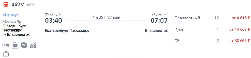 На октябрь-ноябрь минимальная стоимость билета в Владивосток составляет 5092 (поезд 002Э Россия, Плацкарт), а максимальная — 50472 (поезд 002Щ Россия, Люкс).