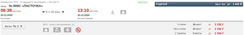 Ходит ежедневно. Отправляется в 06:38/06:42, прибывает в 13:10. Время в пути составляет 6 часов 28/32 минуты. Это самый ранний рейс в Ростов-на-Дону. Будьте внимательны, стоянка состава в Ессентуках — 2 минуты, приходите на вокзал заблаговременно.