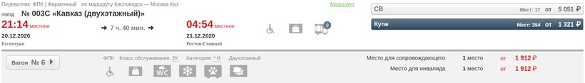 Поезд № 003С «Кавказ (двухэтажный)» является фирменным, скорым. Курсирует ежедневно, за исключением марта (практически весь месяц нет выездов). Отправляется в 21:14, прибывает в 04:54/04:53. Продолжительность поездки составляет 7 часов 39/40 минут. Рейс ночной, несмотря на то, что придется заказывать трансфер с вокзала Ростова-на-Дону (общественный транспорт в такое время еще не ходит), подойдет пассажирам, которые планируют добраться до пункта назначения как можно раньше. В поезде есть только две категории вагонов — купейные, спальные. Сервис на высоком уровне. В стоимость билета входит: