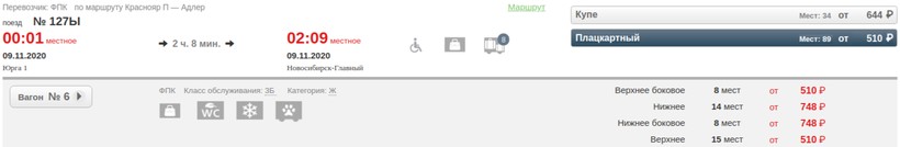 На ноябрь-декабрь минимальная стоимость билета в Новосибирск составляет 396 (поезд 601Н, Сидячий), а максимальная — 8271 (поезд 115Н Омич, Люкс).