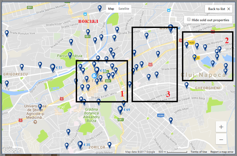 - Ещё один примечательный район — Георгени /Gheorgheni — обозначен цифрой 2. Он подойдет любителям природы, здесь много парков и есть озера, а также семьям с детьми и любителям шопинга (благодаря огромному торговому центру). Цены на жилье незначительно отличаются от Центральног, а главный минус — удаленность от основных достопримечательностей — около часа пешком.