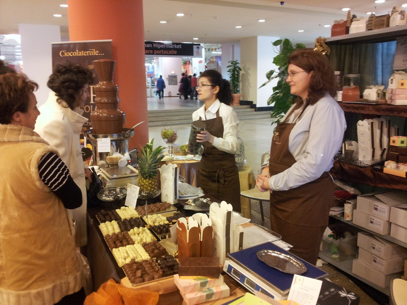 Единственный магазин бельгийского шоколада в городе. Вот уж откуда было тяжело уходить. Широкий выбор свежих пралине и фигурок, изготовленных в румынской провинции в городке под названием Горж. Шоколад стоит дорого, но мы не могли удержаться и некупить кое что, уж больно всё аппетитно выглядит, да ещё и шоколадный фонтанчик так и манит.