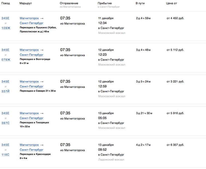 Прямого поезда Санкт-Петербург — Магнитогорск, не говоря уже об Санкт-Петербург — Новоабзаково, нет, есть варианты с пересадками. Такое путешествие займет у вас не меньше двух с половиной дней в одну сторону, поэтому в данном случае рекомендую делать выбор в пользу авиаперелетов.