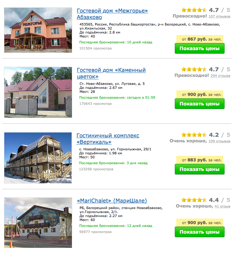 Что касается проживания в Новоабзаково — отелей много, конкуренция высокая, поэтому обслуживание должно быть как минимум неплохое. Цены варьируются: есть варианты снять квартиру или комнату у хозяев, это может стоить и 600 руб/сутки, можно снять номер в отеле, 1000-5000 руб/сутки. Об аренде квартиры можно узнать здесь, а об отелях – тут.