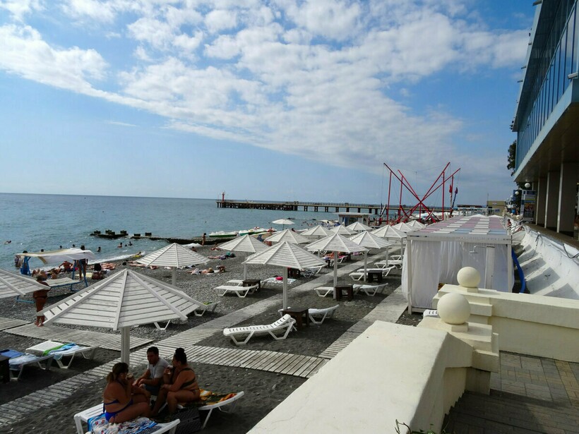 Прибрежная полоса в этом месте Адлера достаточно широкая. Поэтому, несмотря на большую популярность зоны отдыха, здесь всегда найдется свободное место. Если же хочется покоя и тишины, стоит приходить сюда ранним утром или после 17.00.