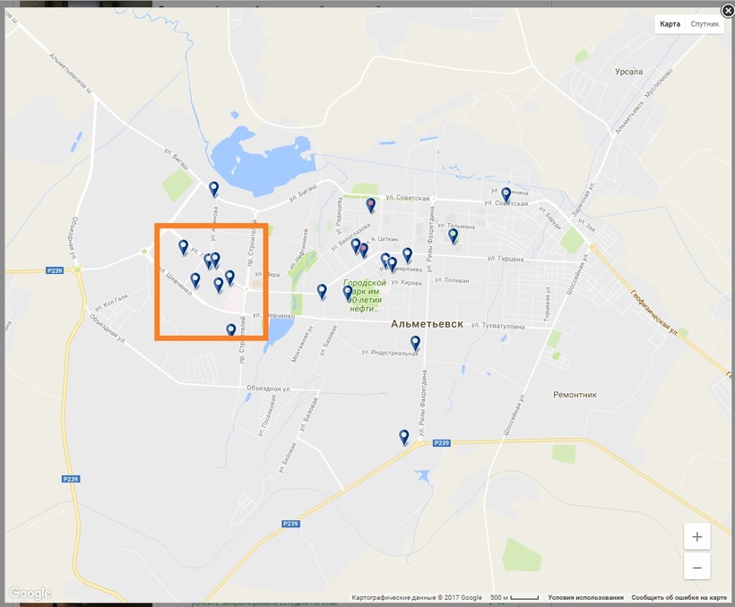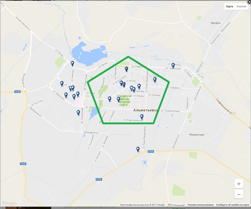 - Альметьевск – небольшой город, и ценовая категория во всех отелях примерно одинаковая. Поэтому выбирая номер, остановитесь на гостиницах в центре (на карте район выделен зелёным пятиугольником). Так вы сможете рассмотреть все достопримечательности и при этом жить с прекрасным видом. Кроме того, жить в центре намного безопаснее, нежели в других районах.