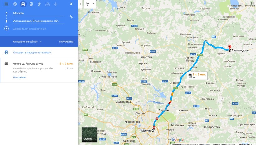 Путешествие на машине из Москвы в Александров займёт не больше двух часов: между городами лежат всего 122 км. Отправляйтесь в путь по Ярославскому шоссе и сверните на Александров на трассу Р75 на границе Московской и Владимирской областей.