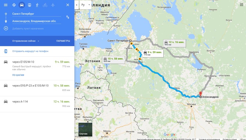 773 км от Петербурга до Александрова можно преодолеть на машине за 10 часов или превратить эту дистанцию в настоящее дорожное приключение, сделав остановки в Великом Новгороде, на Валдае, в Твери и Сергиевом Посаде. Чтобы добраться до цели быстрее, разумнее всего будет проложить маршрут по трассам E105-А108-Р75.