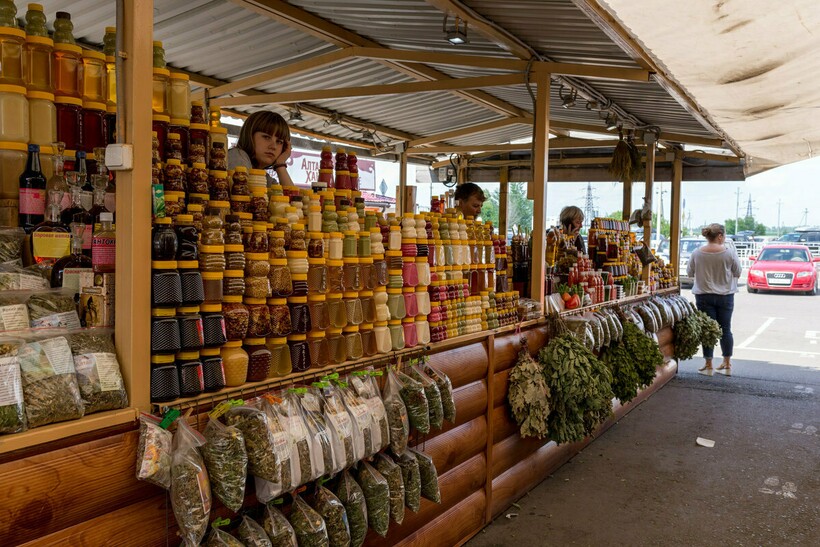 ЭТО ИНТЕРЕСНО! Сувенирный базар возле целебного родника — один из самых больших на Алтае. Если вы еще не успели купить алтайские подарки, не отчаивайтесь. Здесь вы найдете мед, кедровые шишки и варенье из них, орехи, травяные сборы и чаи, берестяные украшения, предметы национального алтайского костюма и музыкальные инструменты.