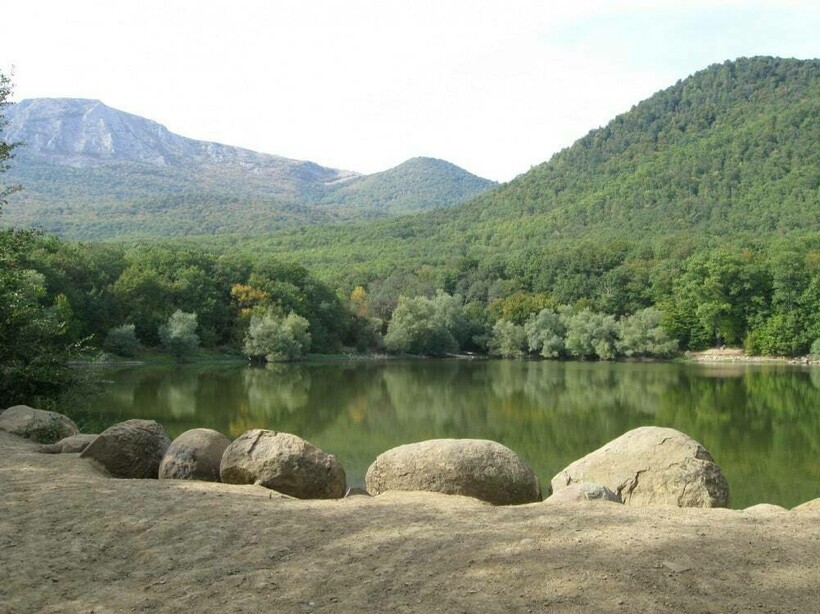 Вокруг озера густой лес, в нем растут крымские сосны, грабы, дубы, но встречаются и полянки, которые заросли ароматными травами. Достопримечательностью водоёма выступают огромные гладкие камни, которые разбросаны по периметру. Их происхождение неизвестно, но считается, что им несколько десятков тысяч лет.